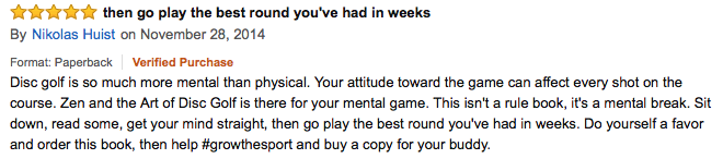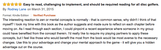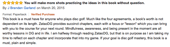“Zen and the Art of Disc Golf is a perfect read anytime of the year to help your disc golf game…It’s safe to say that you’ll take something away from it and in the end, you’ll take steps to being a better disc golfer with the knowledge you’ll gain.” – Zach Parcell (All Things Disc Golf)